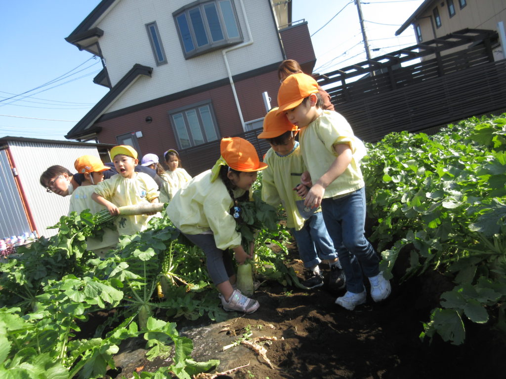 栽培園の大根が収穫時期を迎えたので、子ども達と収穫に行きました。